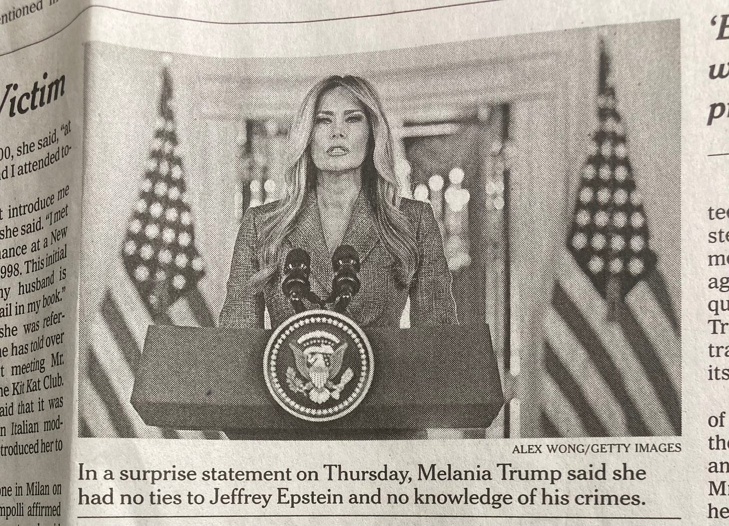 This morning over our Cheerios, as my wife and I were digesting First Lady Melania Trump’s oddball surprise statement about the Epstein scandal, my bride noted: “You’re one of the few men who hasn’t been implicated with this Epstein mess.”