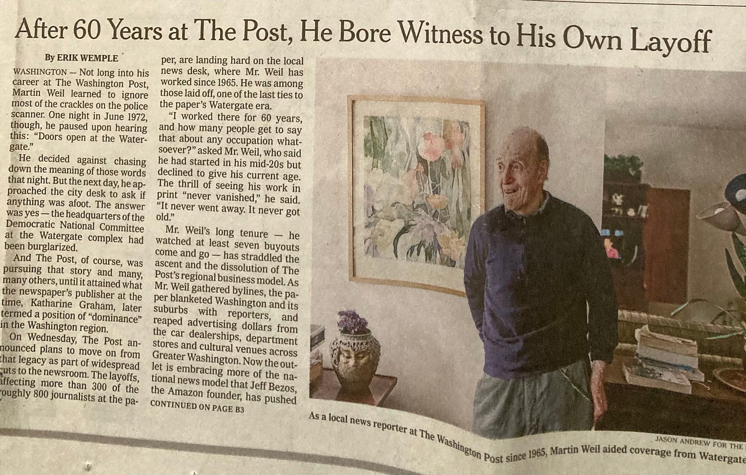 Times reporter Erik Wemple wrote a poignant feature story focusing on one of Bezos’ victims — Martin Weil, who worked at the Post for 60 years as a local news reporter. For most of his career he worked the night shift because he insisted on tinkering with the articles. “I’d say, ‘Oh, that needs improvement.’” Who’s going to do that now? Nobody!
